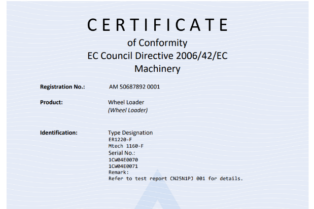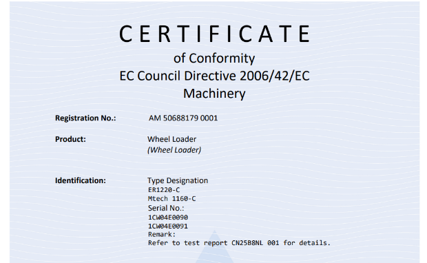 The certificate is based on a real test of a sample machine. TÜV checked the ER1220 against the rules in Annex I of Council Directive 2006/42/EC, also called the Machinery Directive. This shows the loader meets the key legal standards for machines in the European Union. It also passed the Noise and EMC tests. That means the loader is safe for hearing, and it will not cause harmful electromagnetic interference with other machines.
