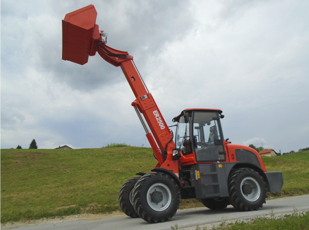 The ER2500 has a telescopic boom that can lift up to 4.5 meters and carry 2,500 kilograms. Its hydraulic system and transmission work very well for all farm tasks. The cab is simple and practical, with a wide view and easy control of all functions.